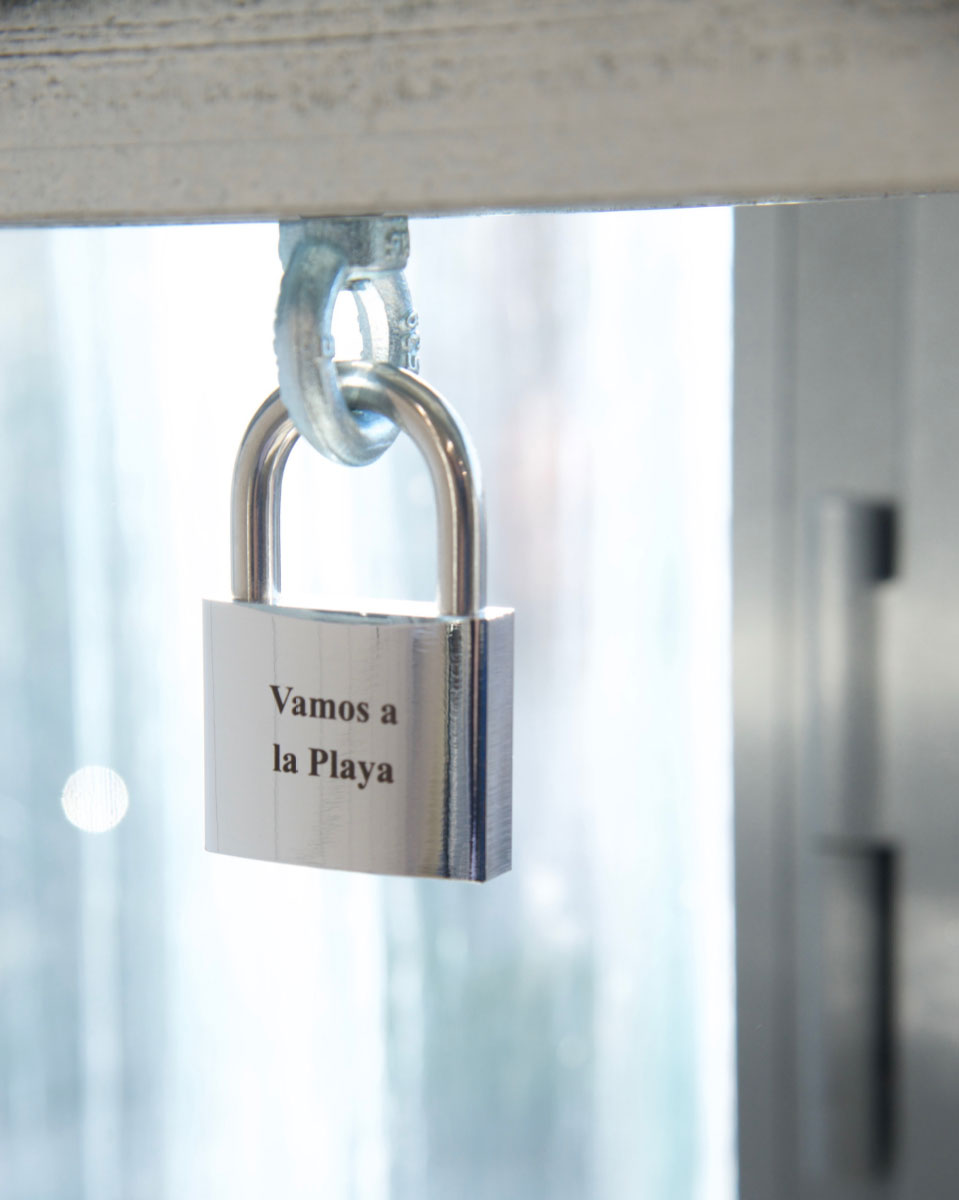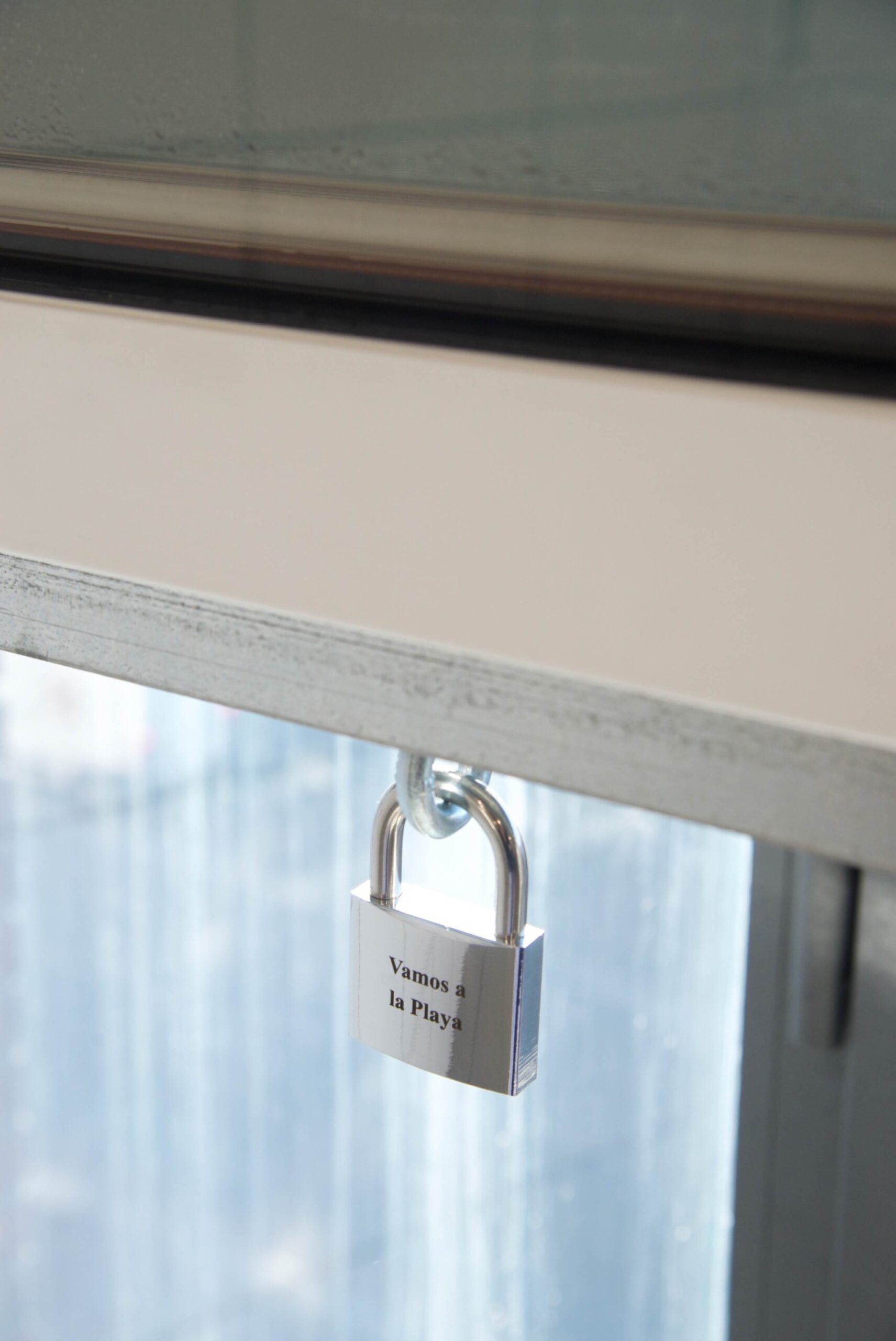 Suspended from the window frame is a padlock engraved with the words “vamos a la playa”, a reference to the 1983 pop song by Righeira. Within the context of the installation, the padlock symbolizes the potential of unlocking a repressed historical era—the Cold War’s atomic anxiety.