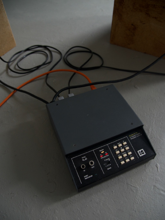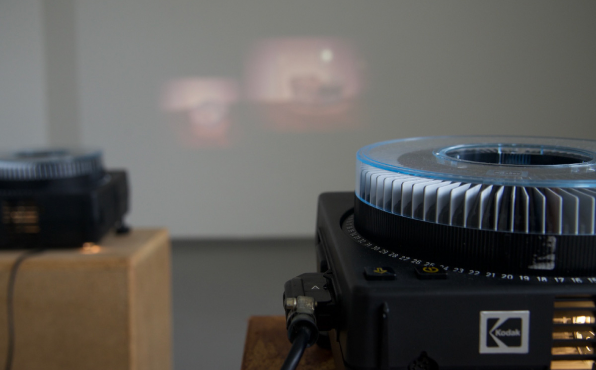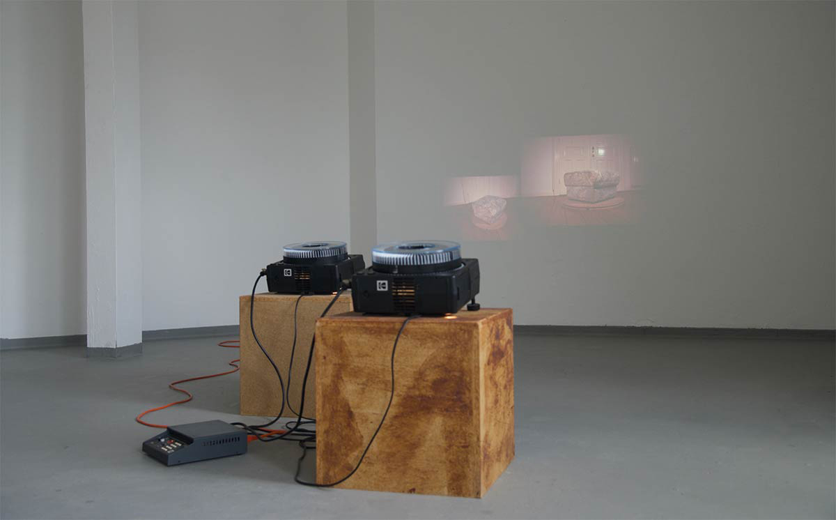 11 min. looping dia slide show installation, 160 analog colour photographs, slide projectors, dissolve control, wooden pedestals
